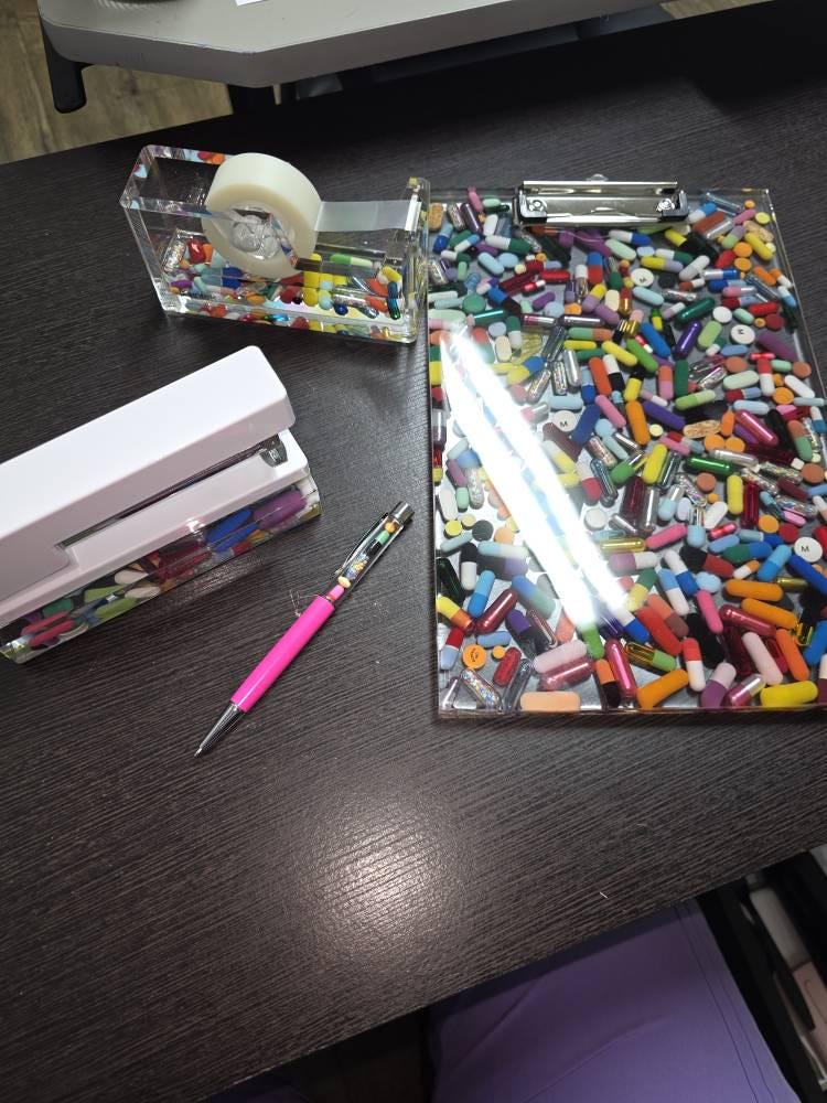 Our super fun Acrylic Tape Dispenser is decorated using a variety of our sprinkle chill pills and rainbow pills and is easily a conversation starter!