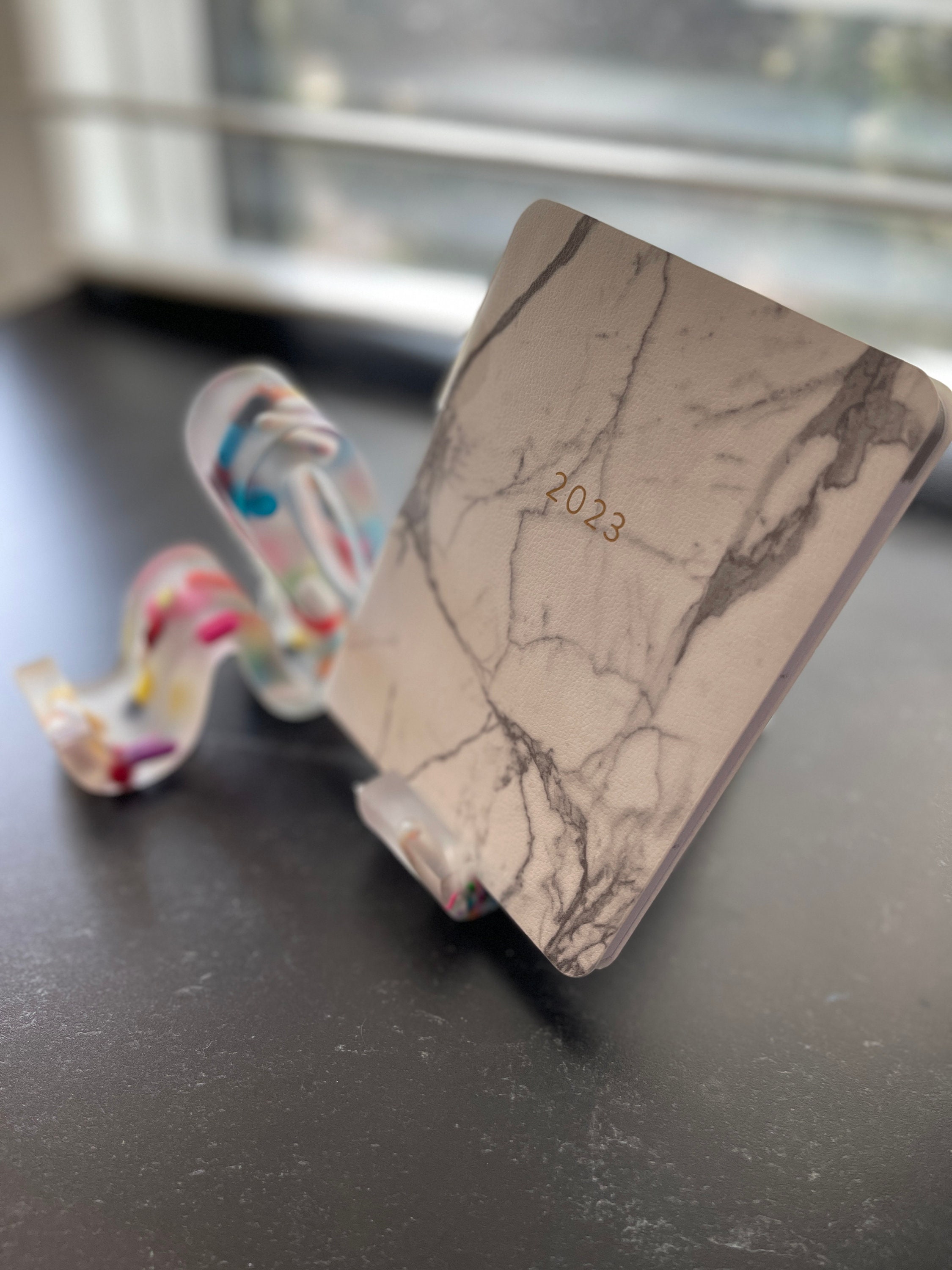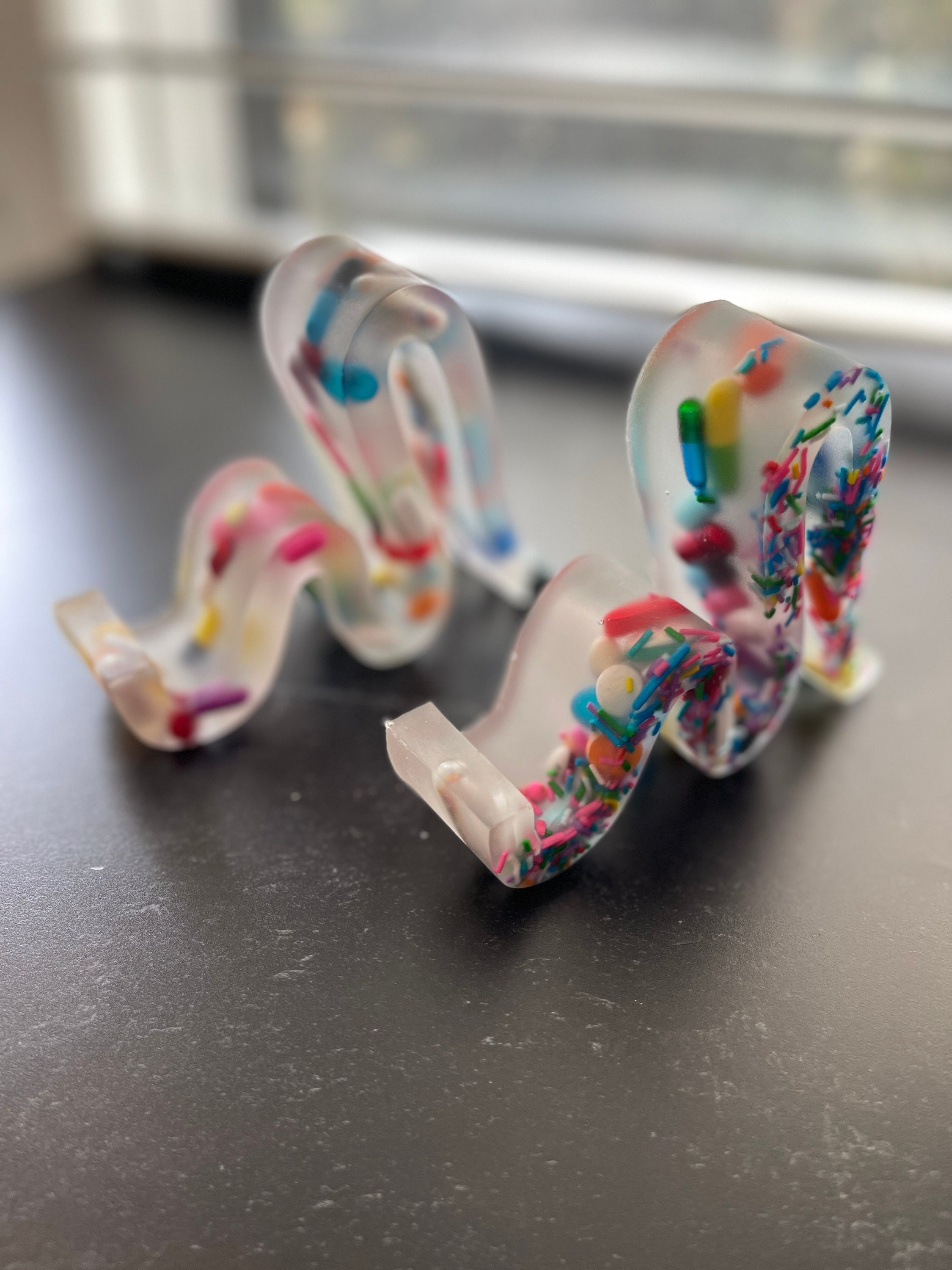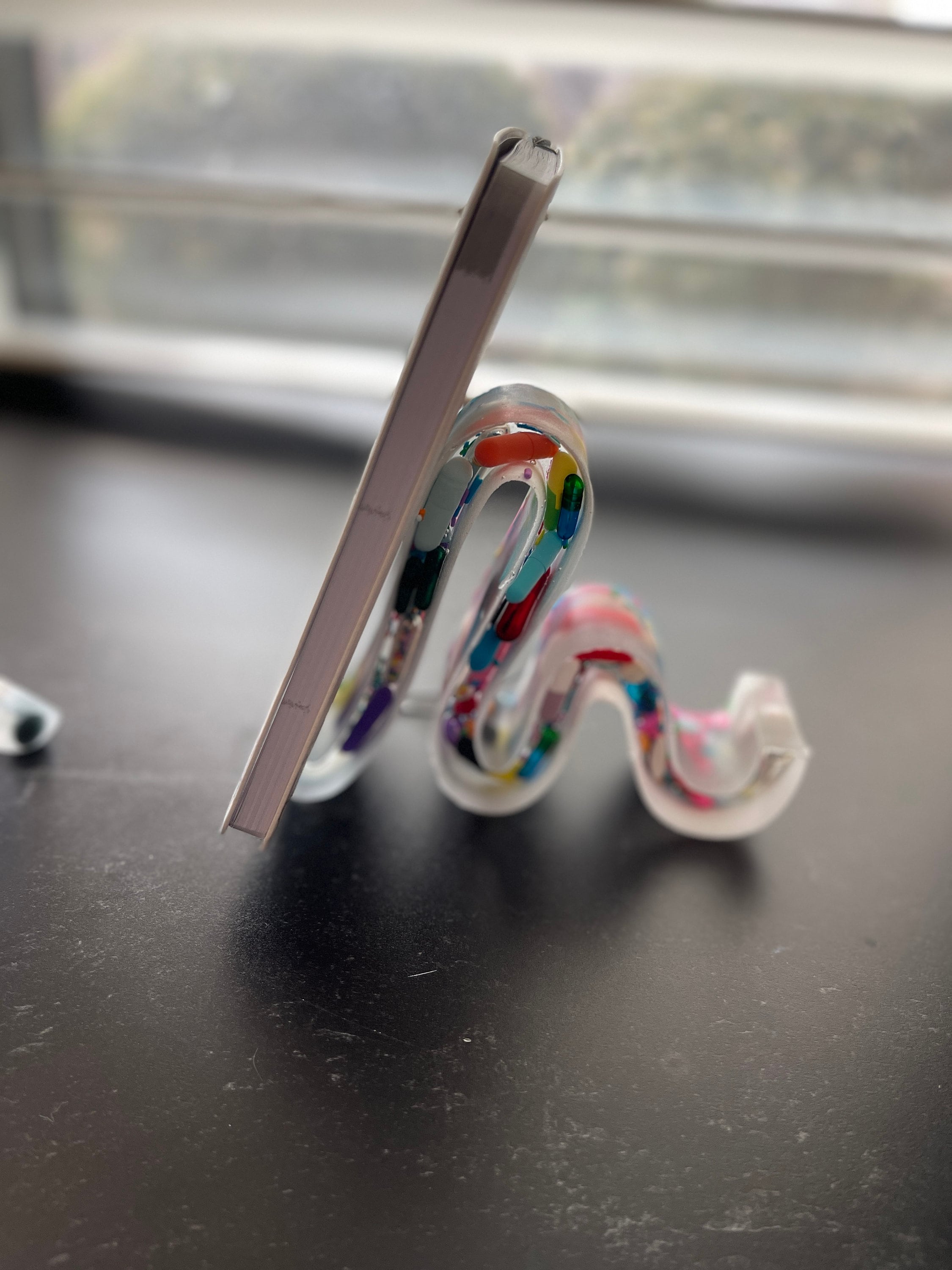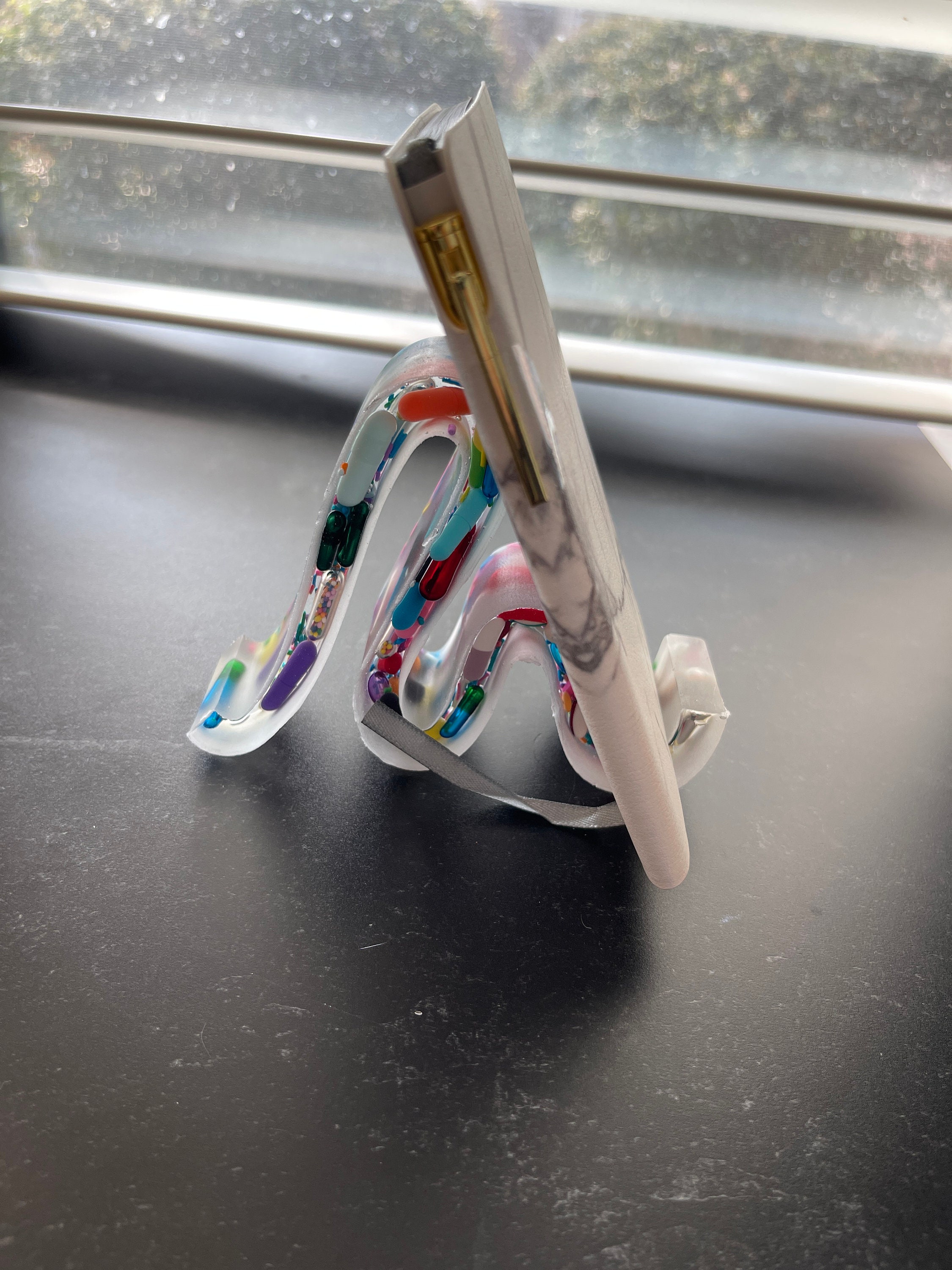 Super fun art piece handmade phone or tablet holder made with transparent resin and pills.