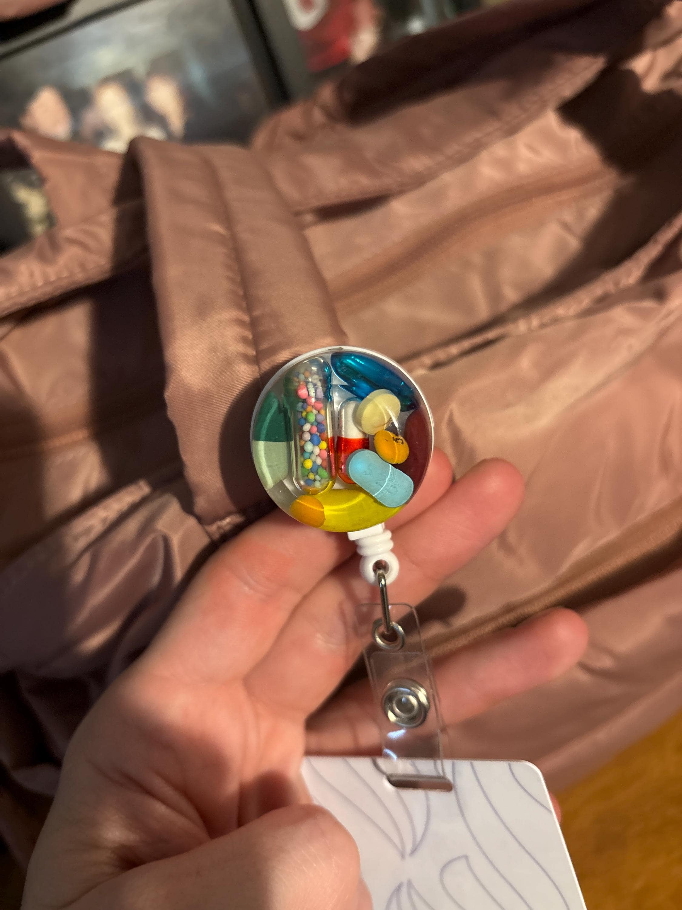 Very cute and I do love the colorful pills. I only wish the it wasn’t as bulky or stuck out as much. The resin is a bit heavy as well and pulls my scrubs down some but it’s still pretty