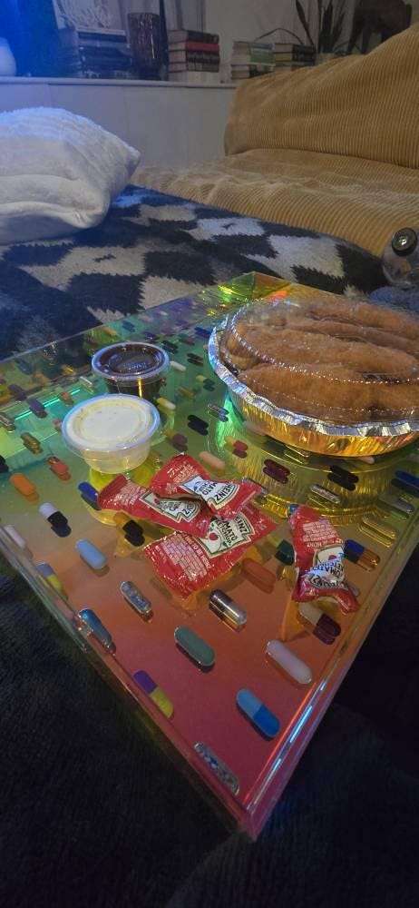This multi-use iridescent acrylic serving tray is decorated using a variety of our sprinkle chill pills and rainbow pills.