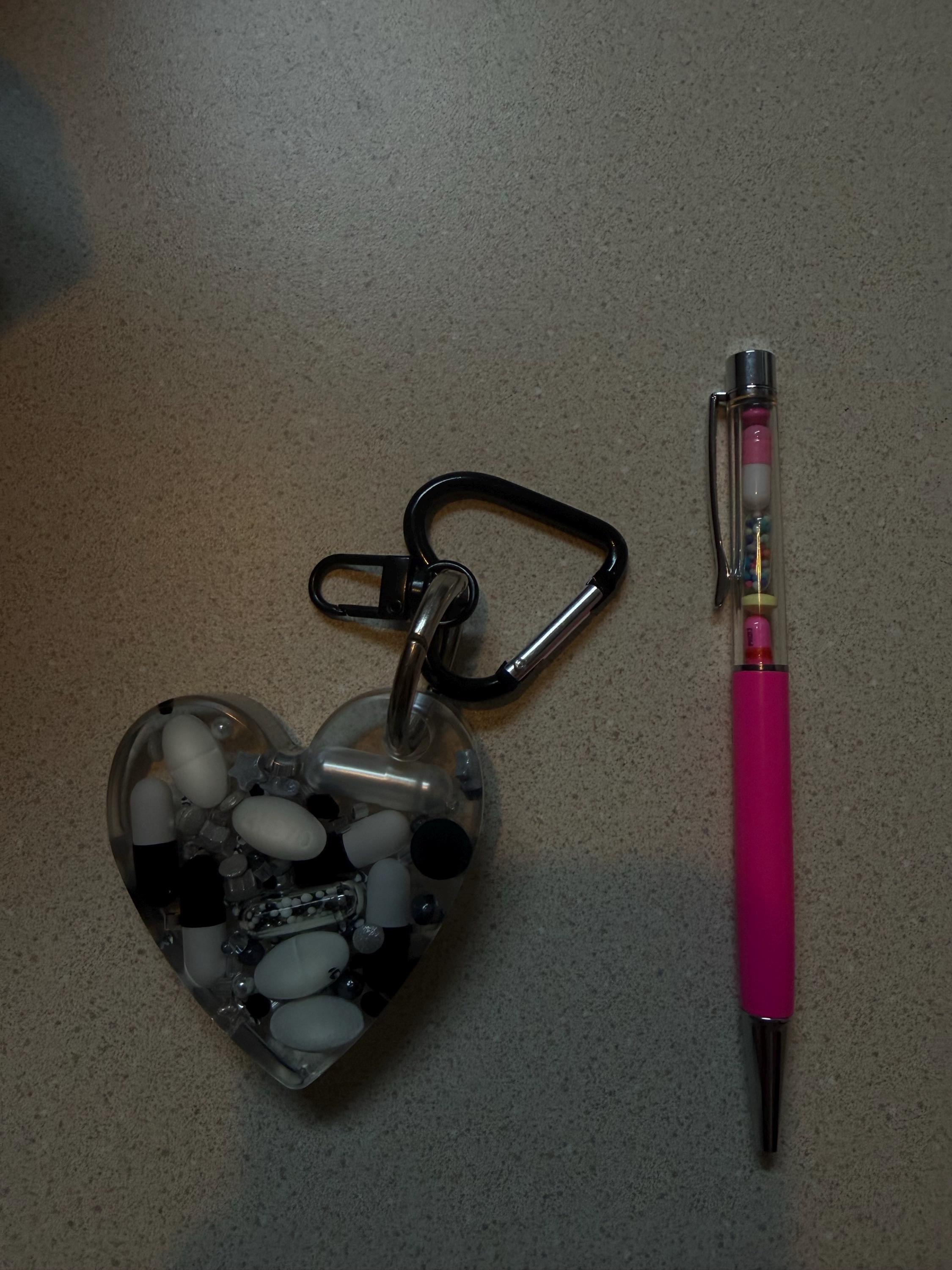 The resin bubble: 2.5” diameter x .5” deep with colorful gelcaps, capsules, caplets and/or sprinkles.