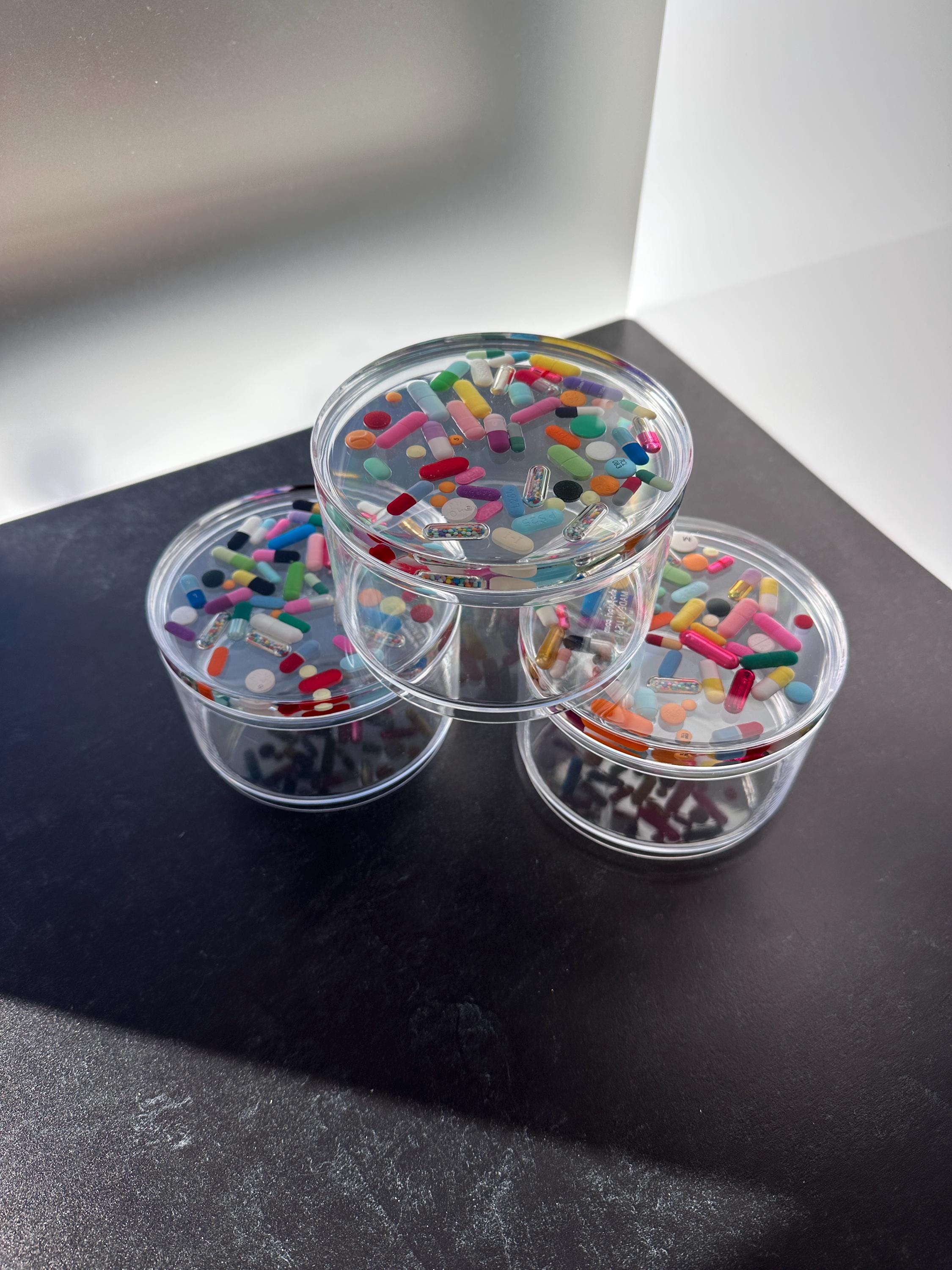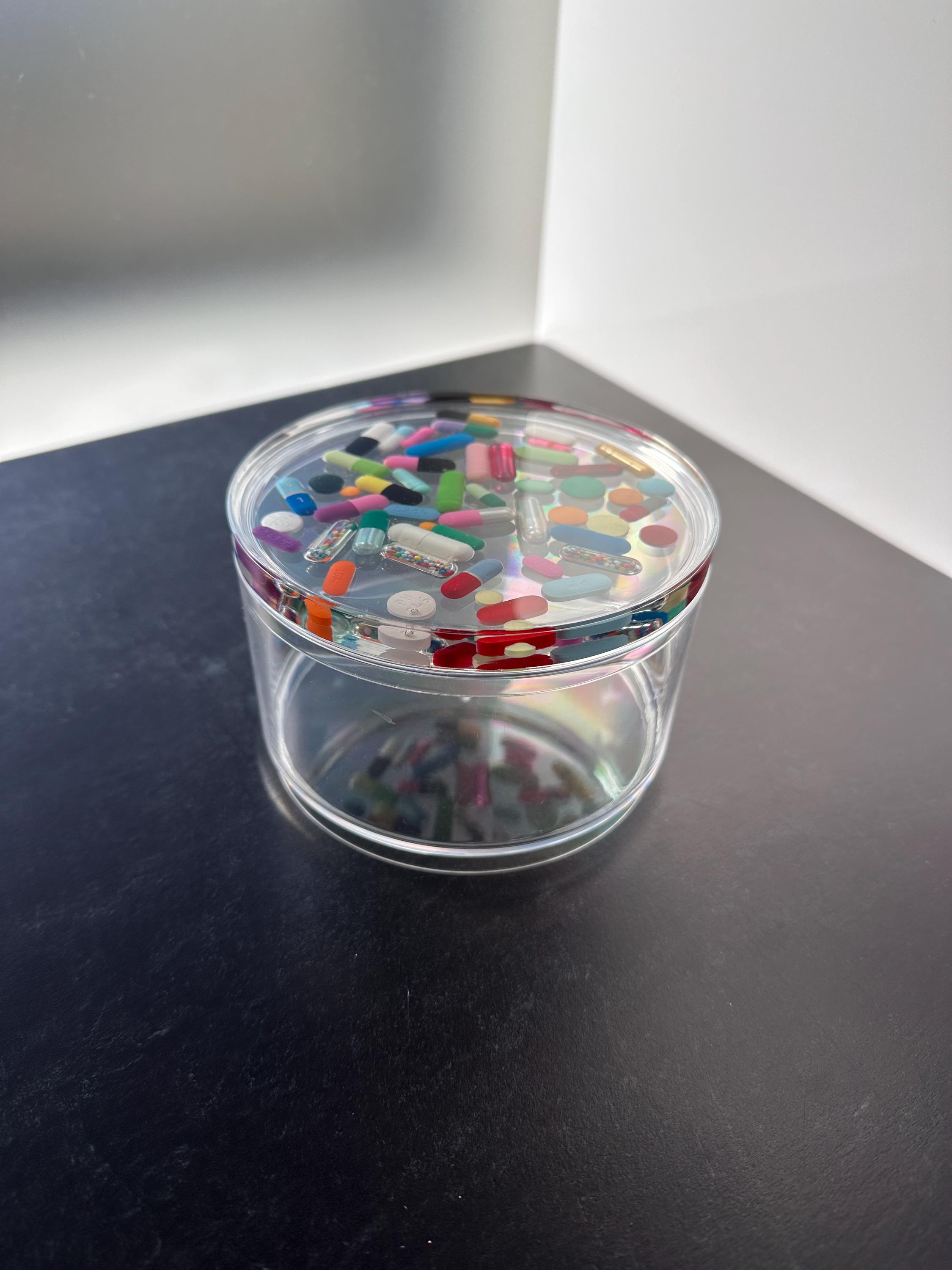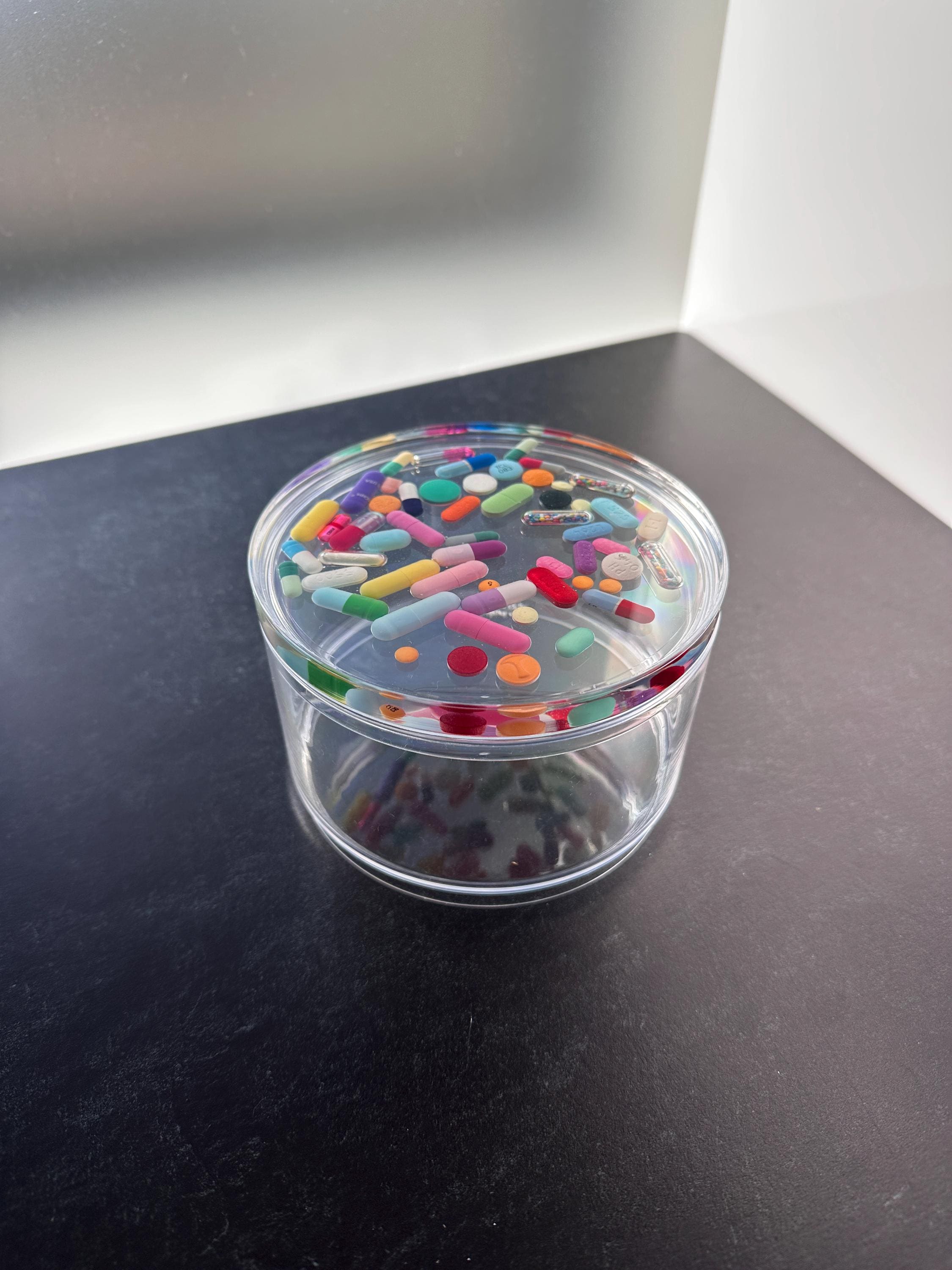 Super fun art piece handmade catch-all canister made with transparent resin and Chill Pill capsules.