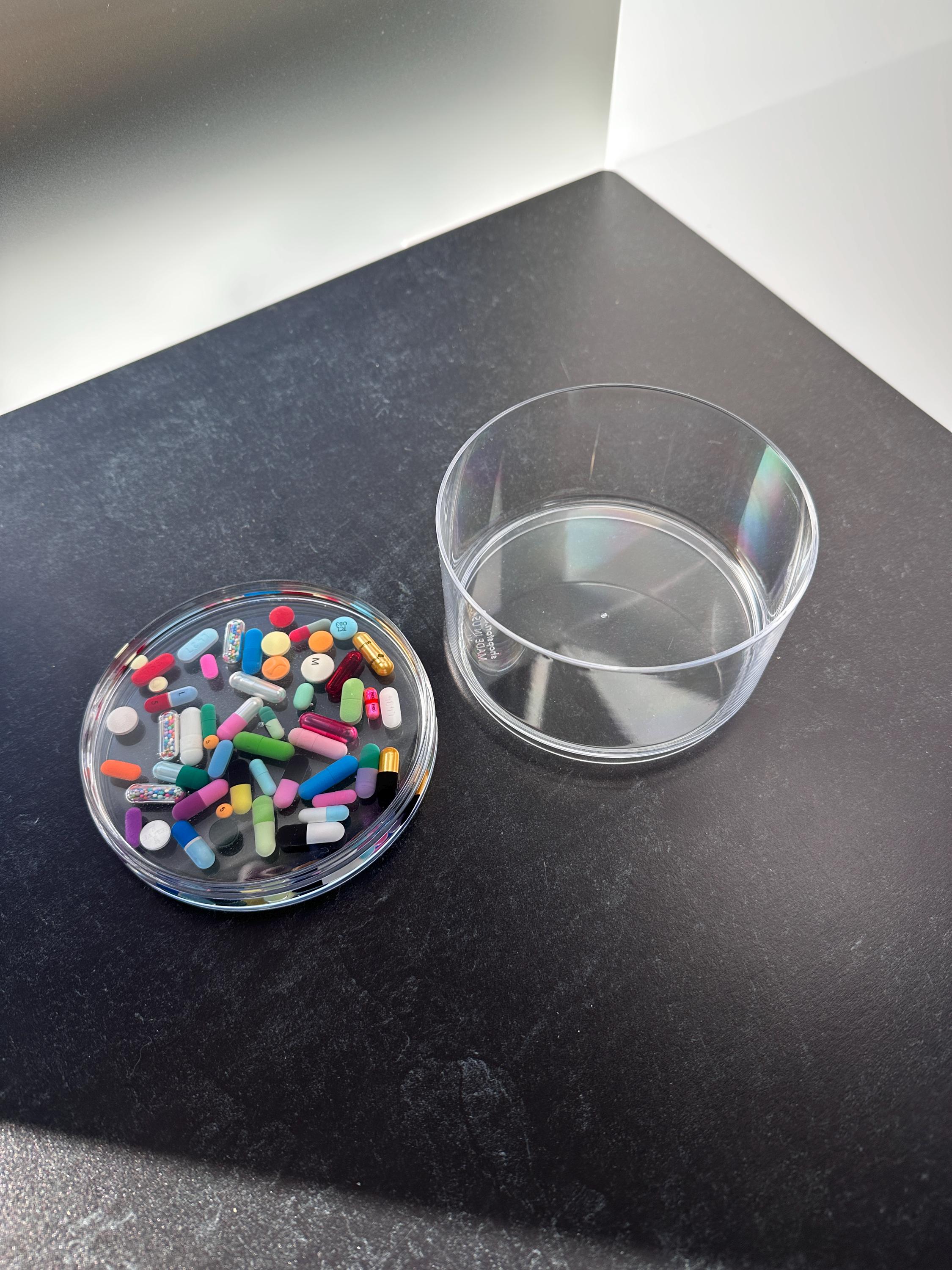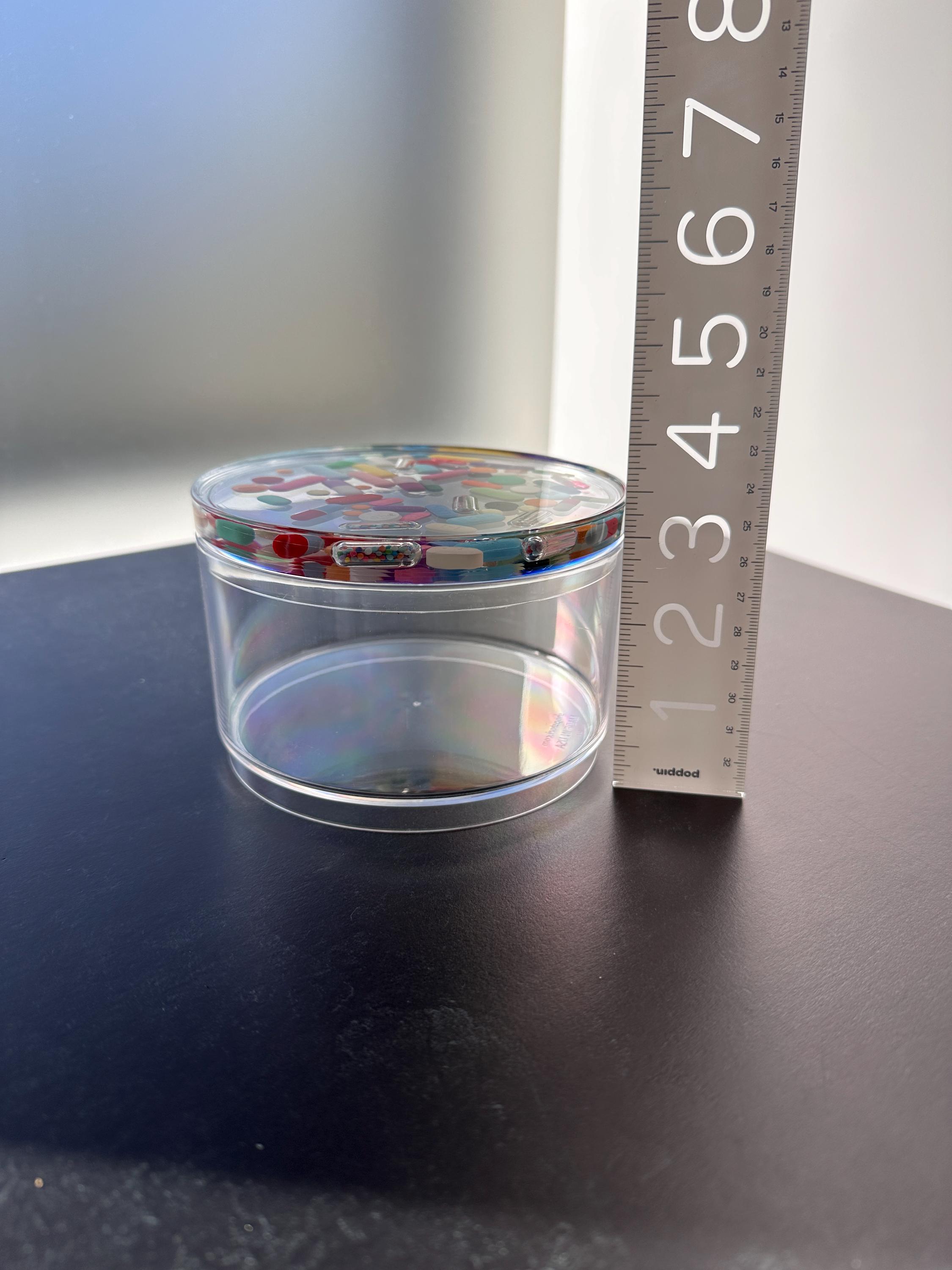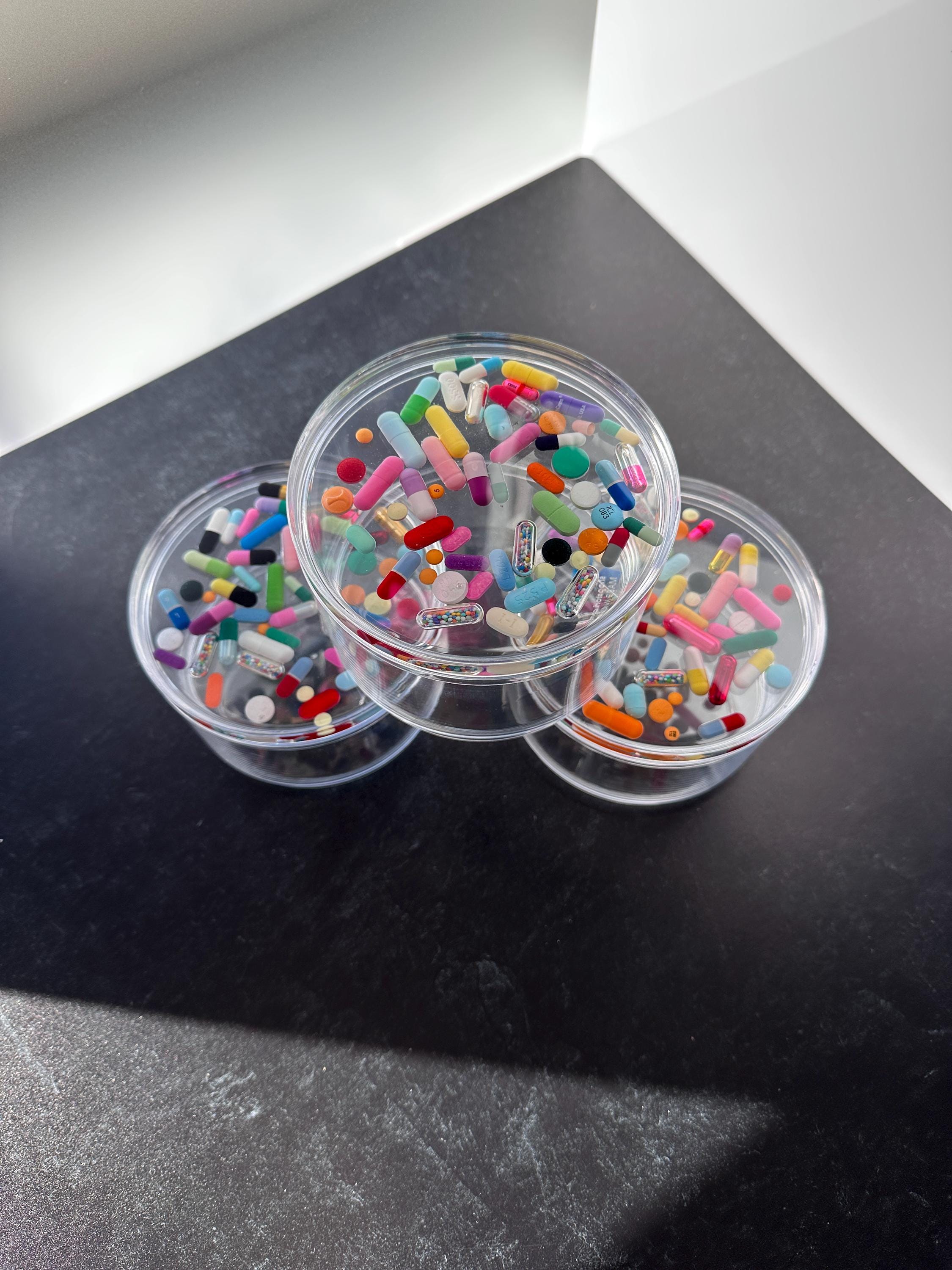 Super fun art piece handmade catch-all canister made with transparent resin and Chill Pill capsules.