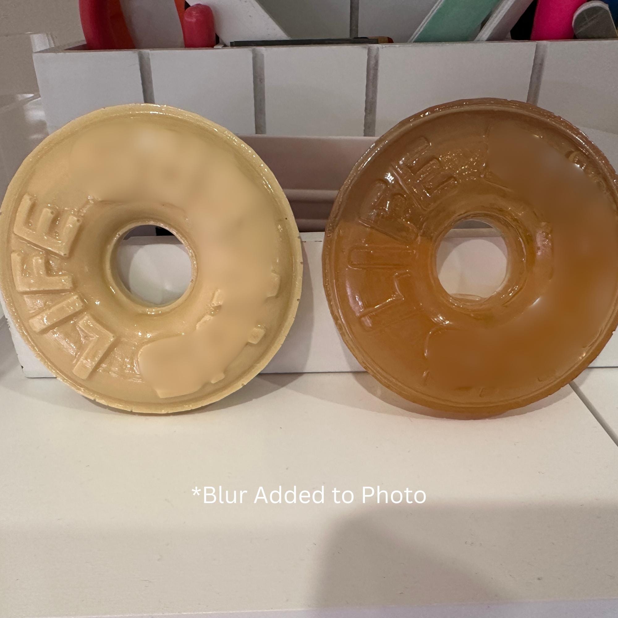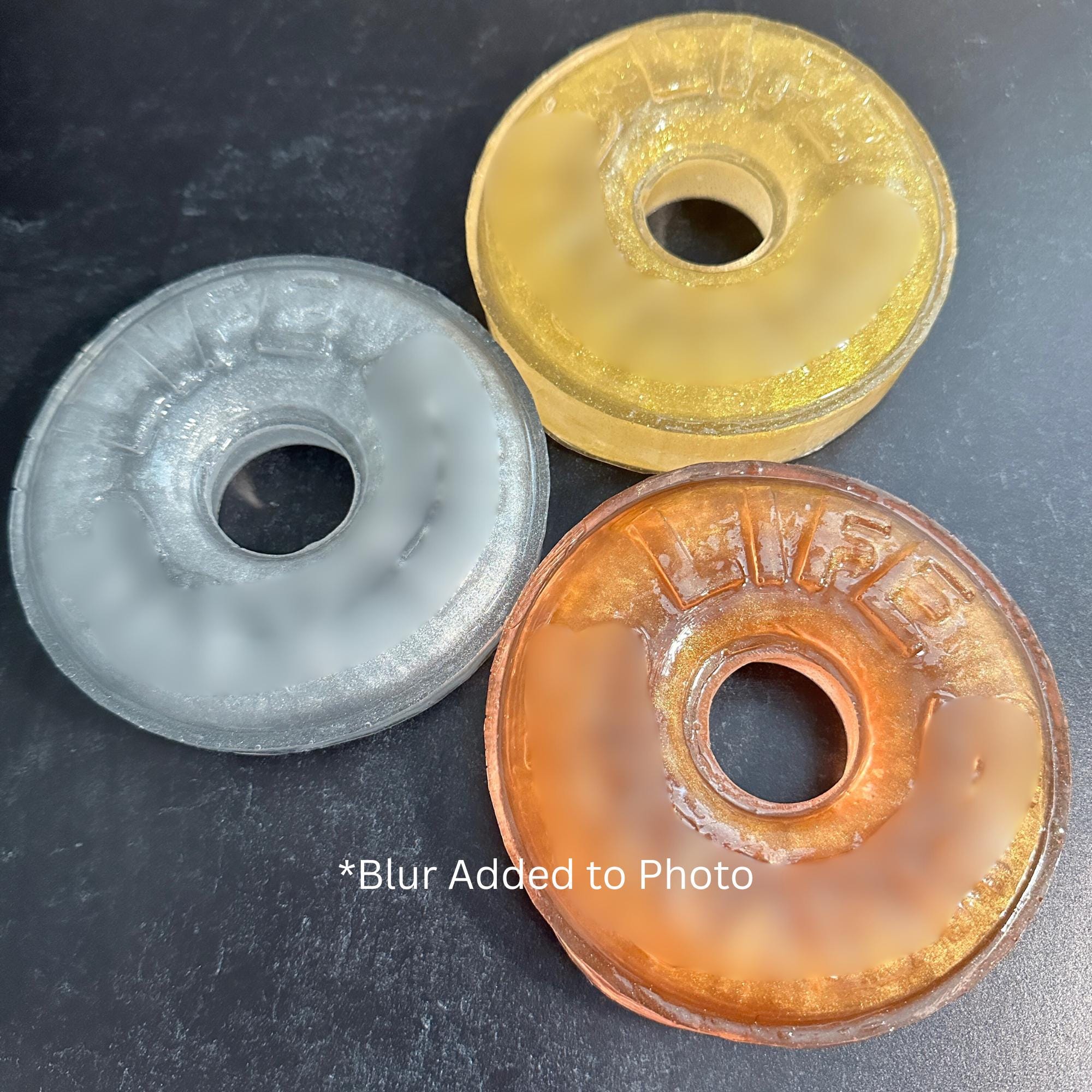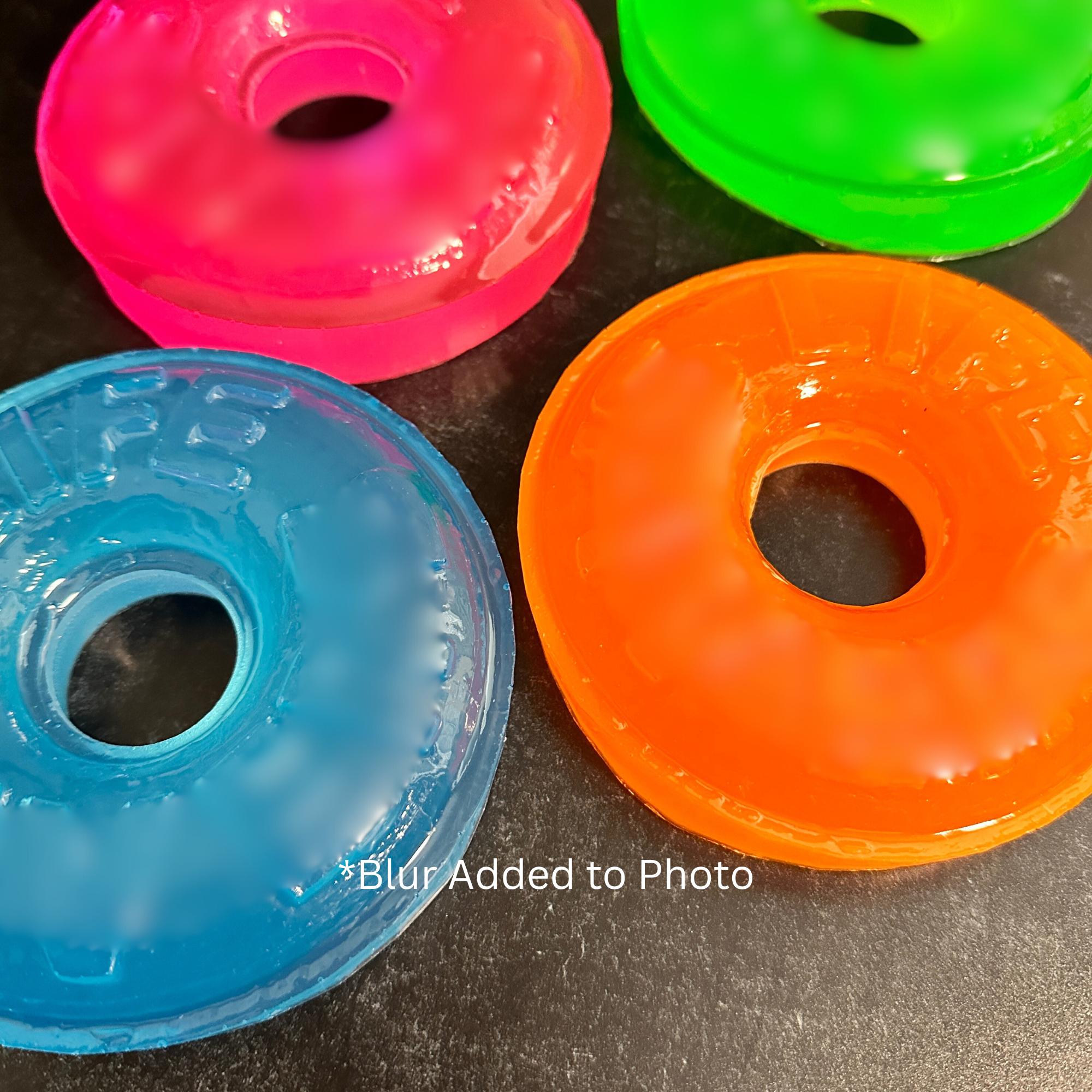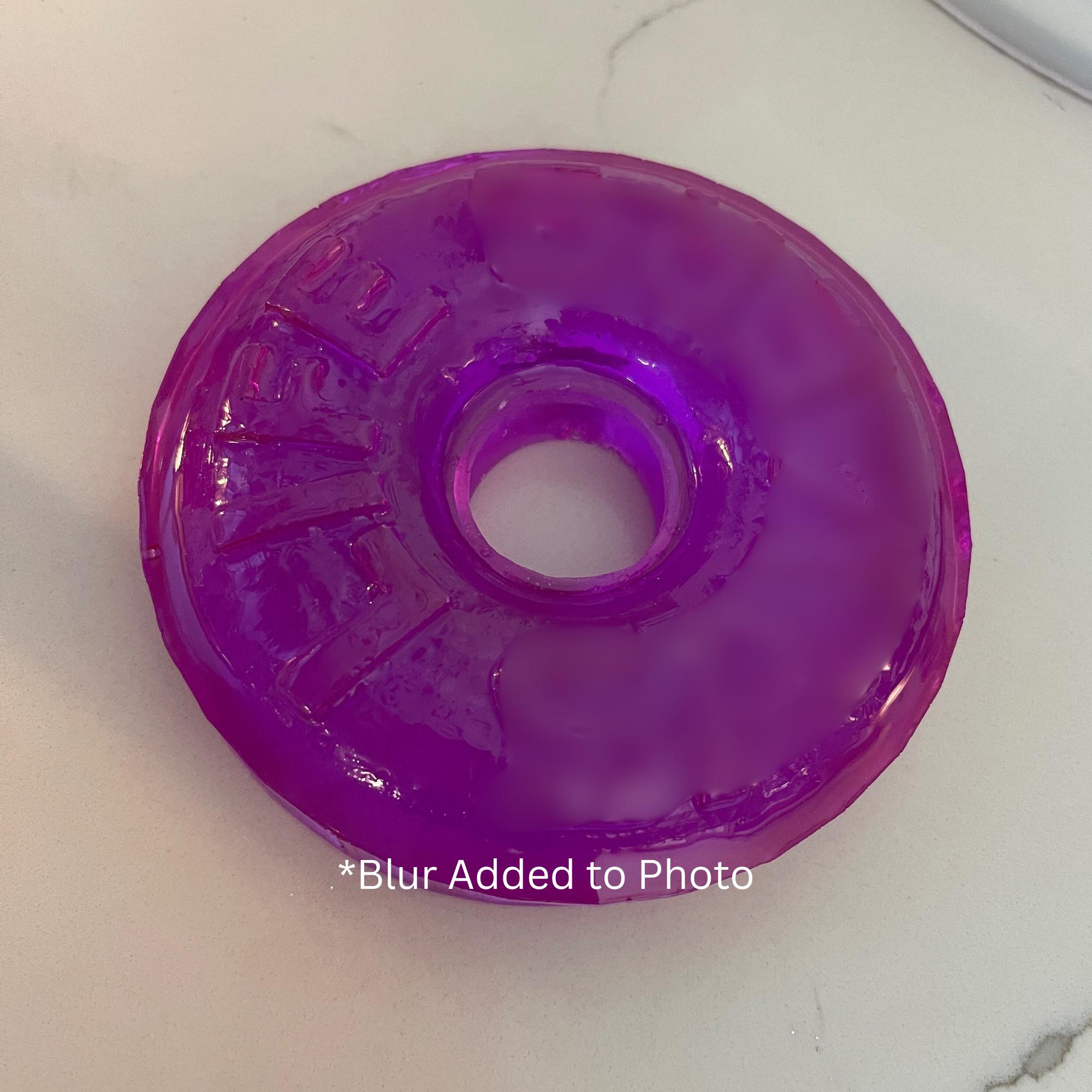 Measuring approximately 5” x 5”, this resin ring features a clean center opening and vibrant color, giving it a playful yet modern, graphic look. It can be displayed on a wall using an acrylic hanger (attached with super glue) or styled as a freestanding decorative object on a shelf, desk, or tabletop.
