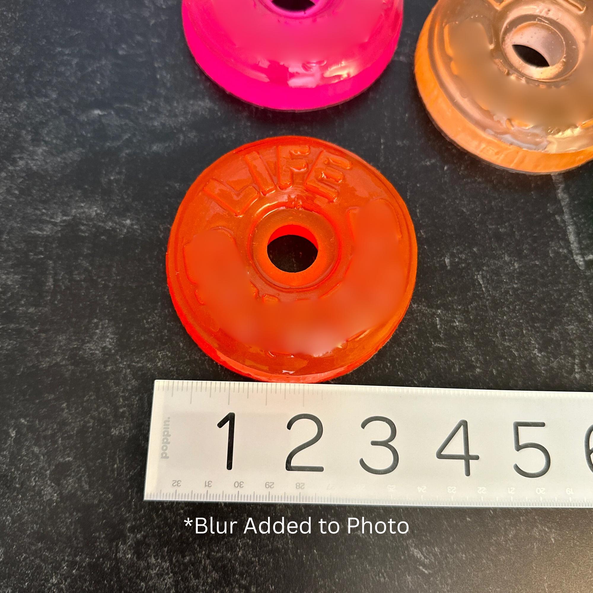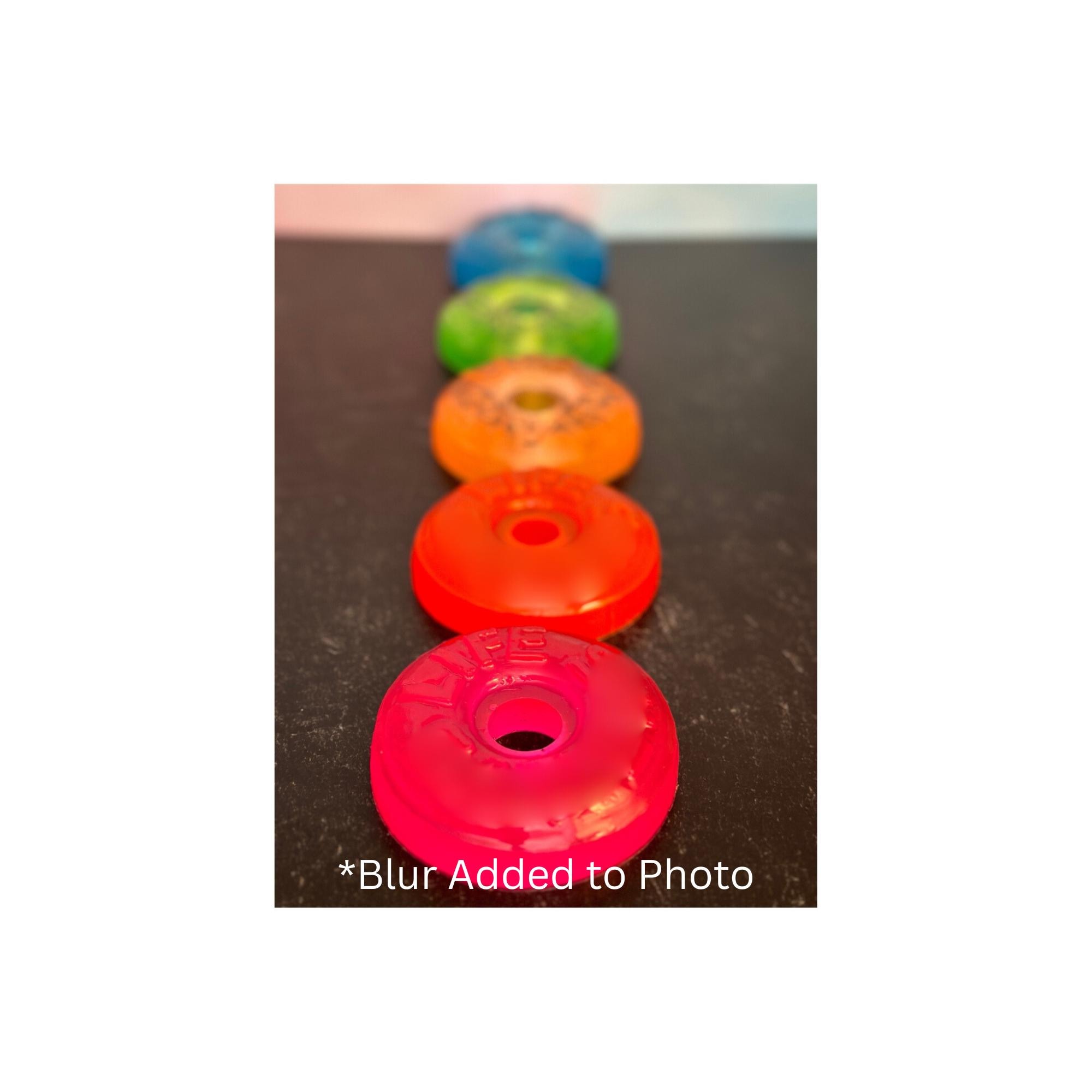 Measuring approximately 3.5” x 3.5”, this resin ring features a clean center opening and vibrant color, giving it a playful yet modern, graphic look. It can be displayed on a wall using an acrylic hanger (attached with super glue) or styled as a freestanding decorative object on a shelf, desk, or tabletop.